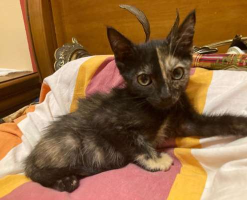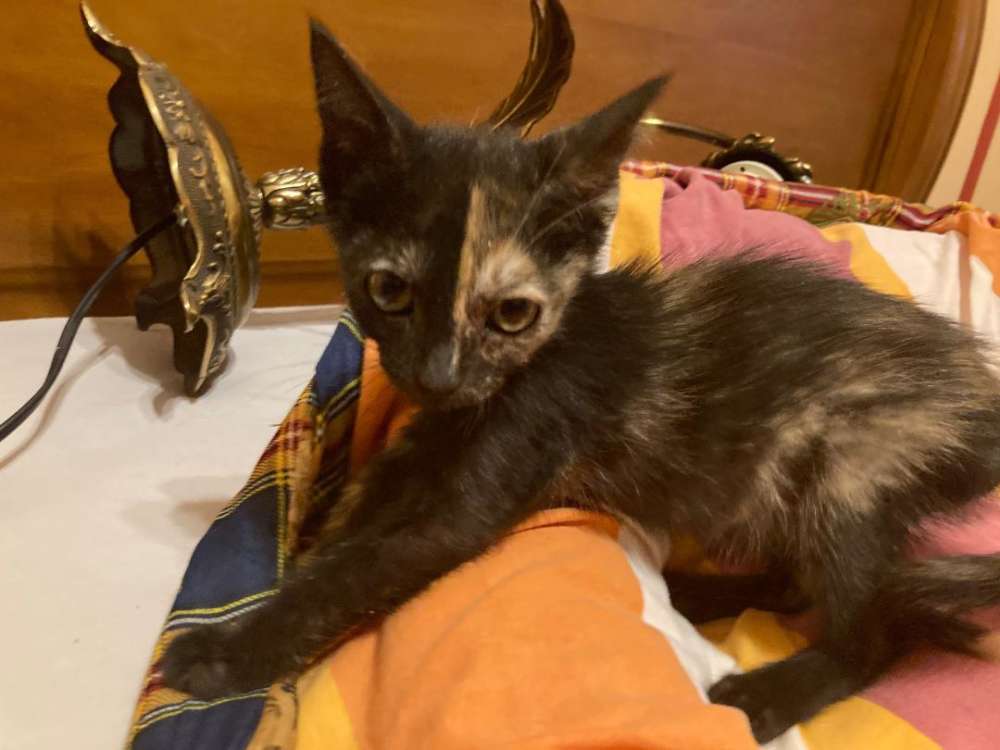 Amatista es la más tímida de los hermanos, tranquila aunque disfruta muchísimo con las caricias, apta con perros y con unos colores únicos como toda gata carey.