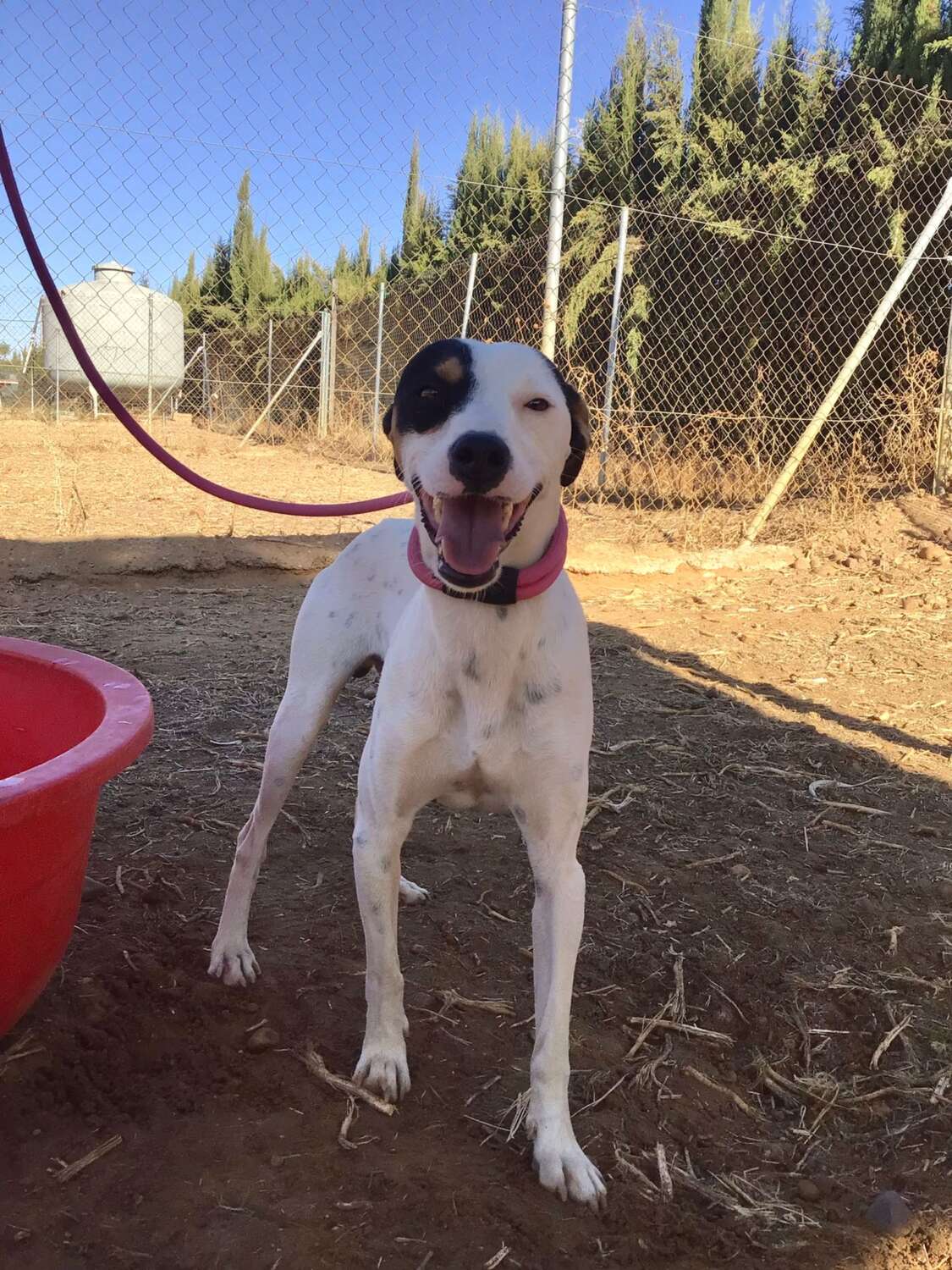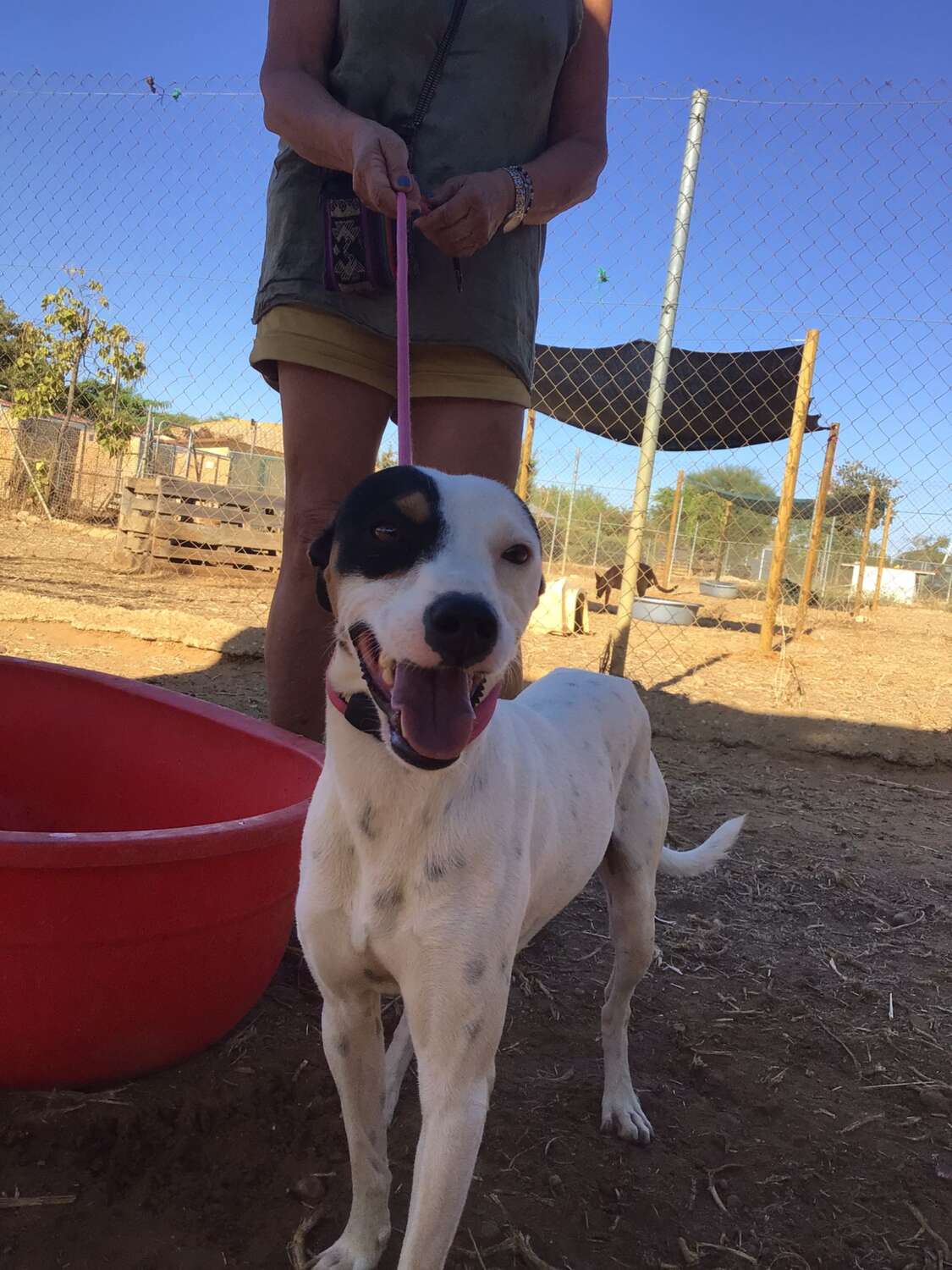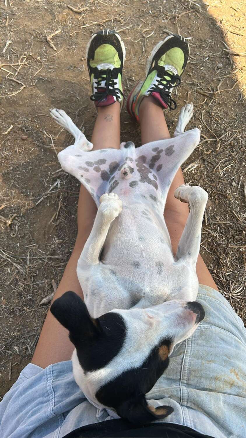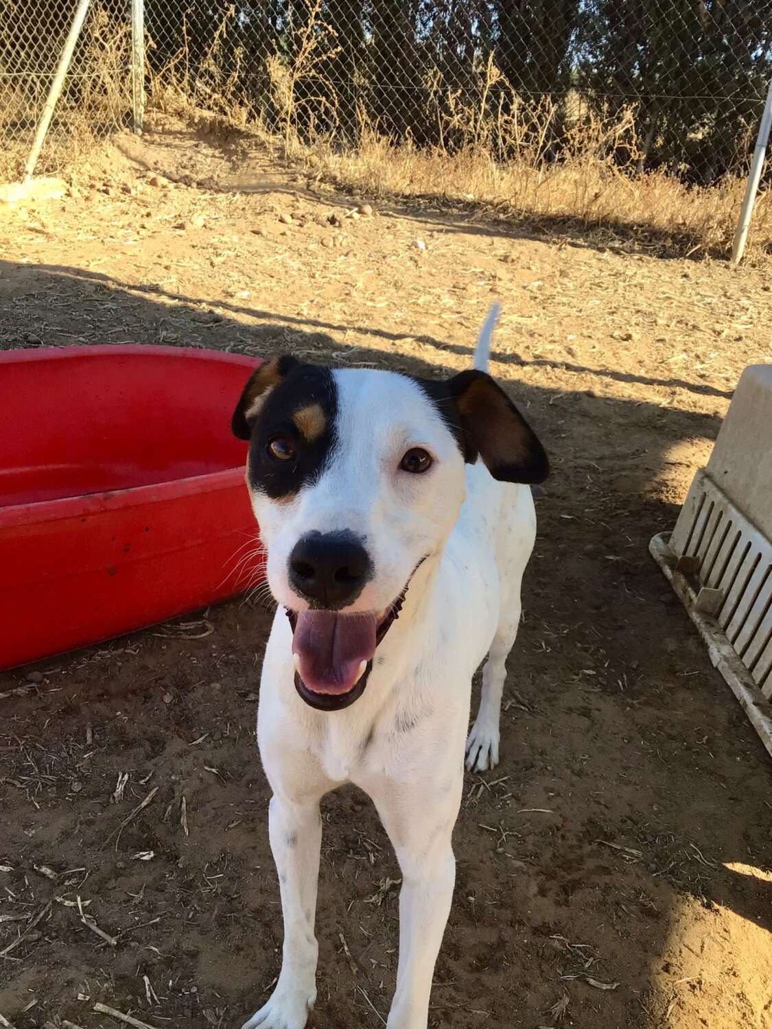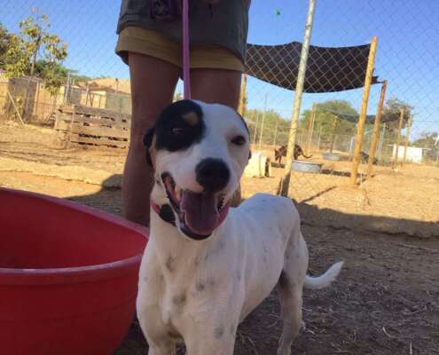A Andrew se lo encontré una voluntaria tirado en medio de la carretera, totalmente acostado, mientras iba en el coche. Vviendo que no se movía, se acercó a él. La miraba como si ya no le importara nada en la vida, agotado, rindiéndose a que le pasará lo que le tuviese que pasar. Lo cogíó en brazos y estaba súper flojo, apenas se movía, hasta tal punto que pensó que lo habían atropellado. Lo llevó al veterinario y allí, tras darle agua y estar un rato en el fresquito, se consiguió sentar. El veterinario comprobó que no tenía nada grave, no había sido atropellado, solo estaba agotado, sediento y muerto de hambre, también estaba lleno de bichos. Así que lo desparasitaron y fue para cuarentena de Arca.