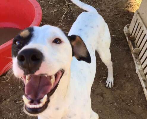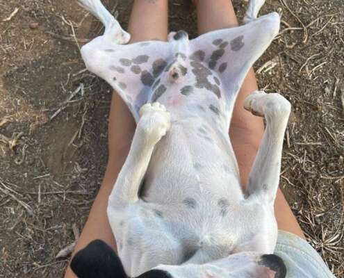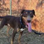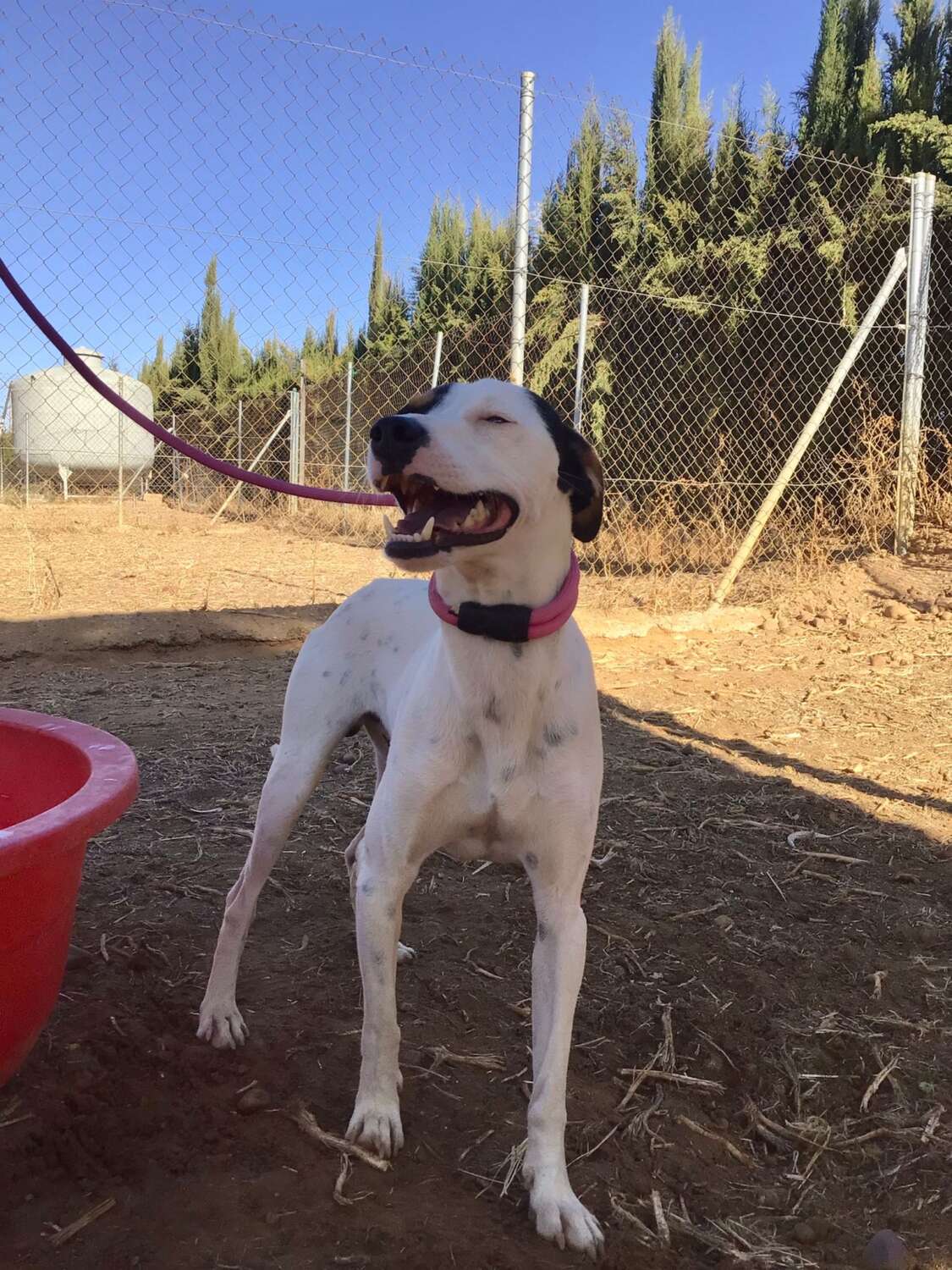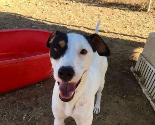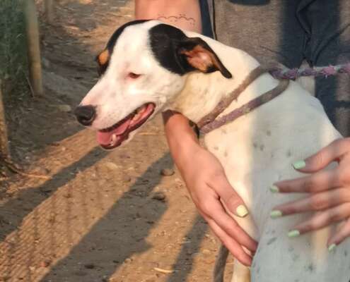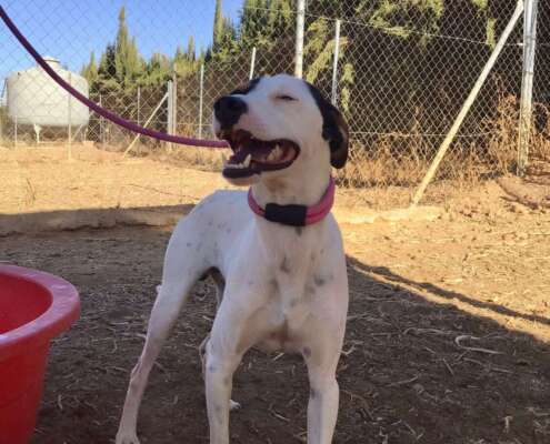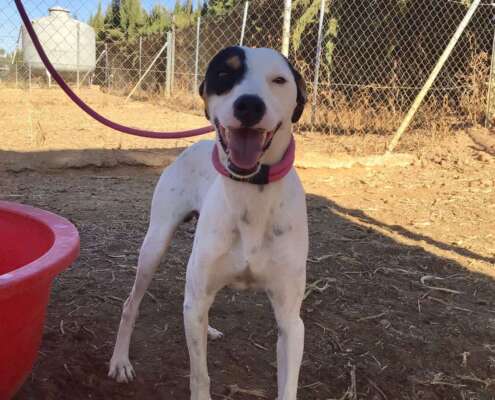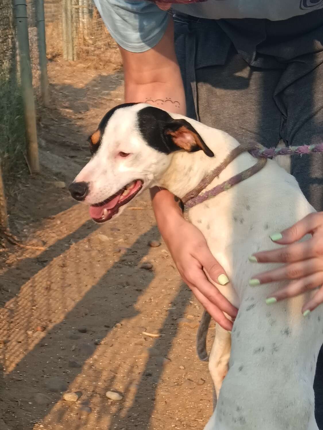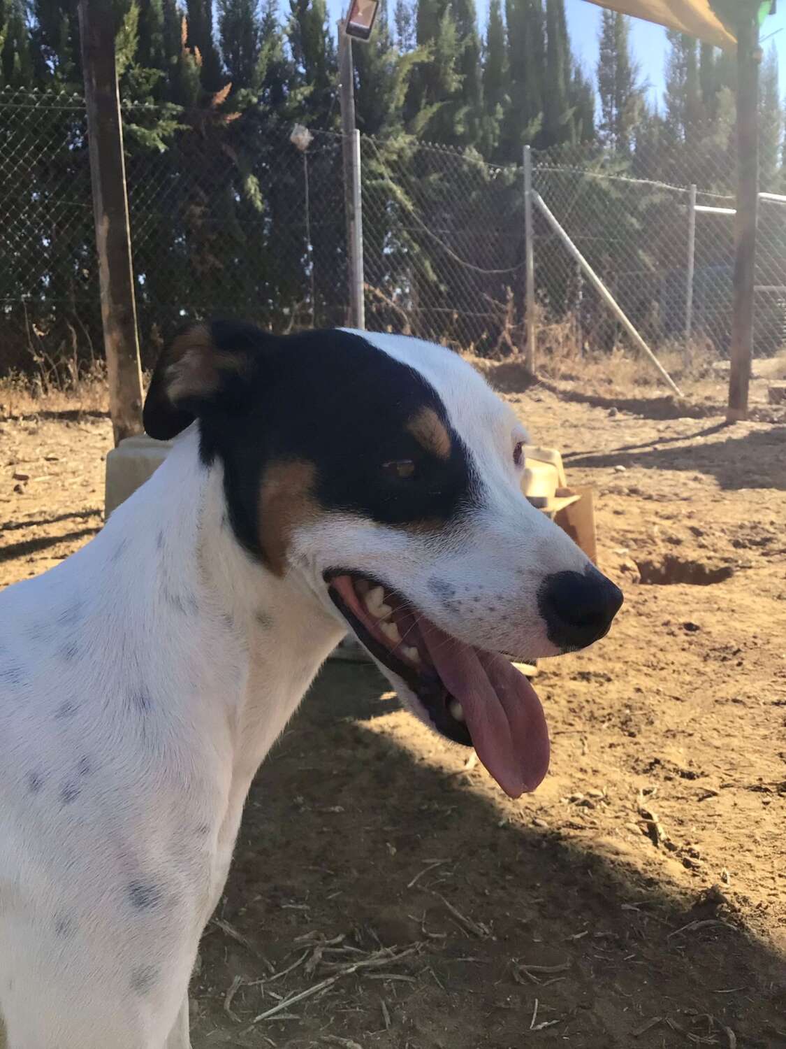 A Andrew se lo encontré una voluntaria tirado en medio de la carretera, totalmente acostado, mientras iba en el coche. Vviendo que no se movía, se acercó a él. La miraba como si ya no le importara nada en la vida, agotado, rindiéndose a que le pasará lo que le tuviese que pasar. Lo cogíó en brazos y estaba súper flojo, apenas se movía, hasta tal punto que pensó que lo habían atropellado. Lo llevó al veterinario y allí, tras darle agua y estar un rato en el fresquito, se consiguió sentar. El veterinario comprobó que no tenía nada grave, no había sido atropellado, solo estaba agotado, sediento y muerto de hambre, también estaba lleno de bichos. Así que lo desparasitaron y fue para cuarentena de Arca.