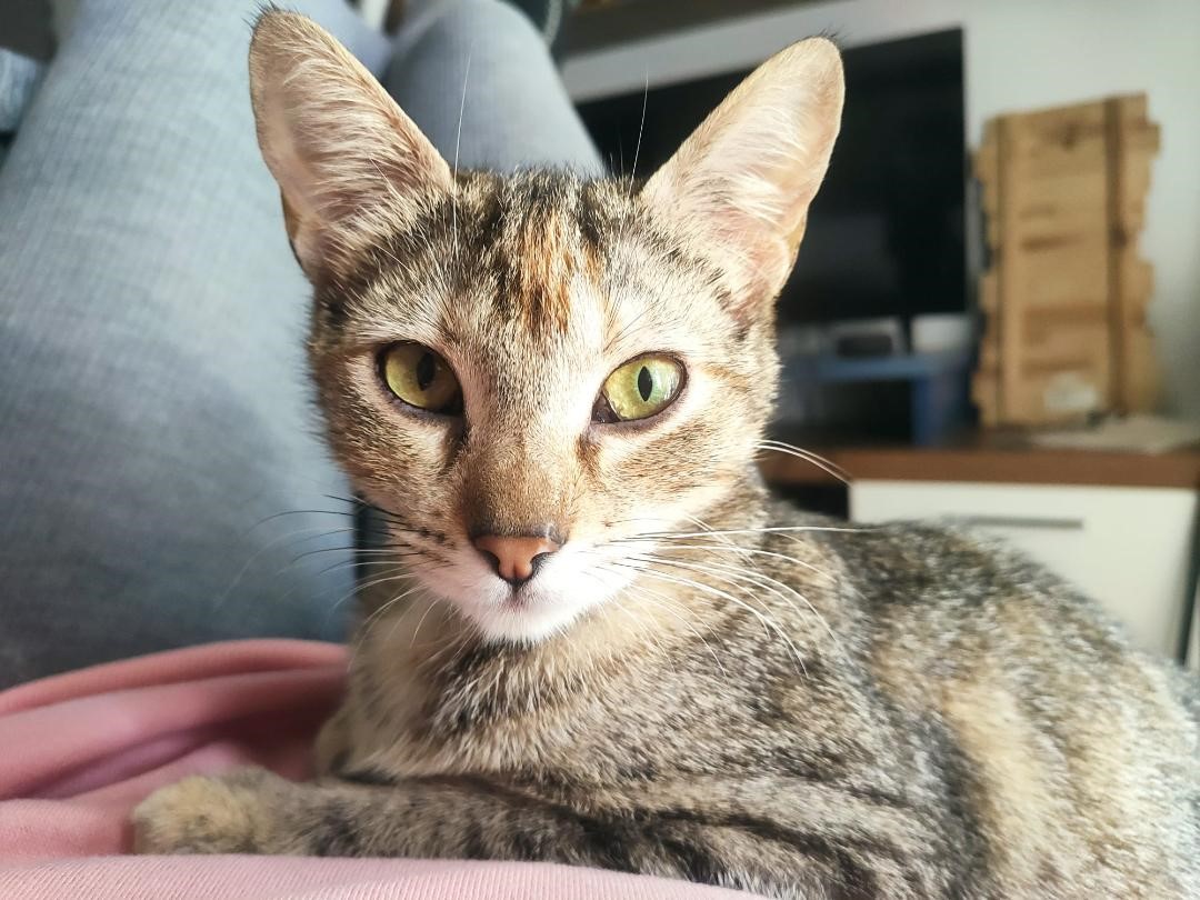 Bengala es súper dulce y cariñosa, no sabe lo que es bufar. Aunque al principio le cueste coger confianza, con una latita por delante nunca dice que no. Ha crecido entre mucho material de fábrica por lo que es muy curiosa y juguetona tanto que ya empezaban a arañar cosas de mucho valor.