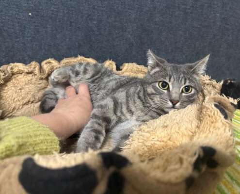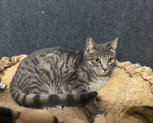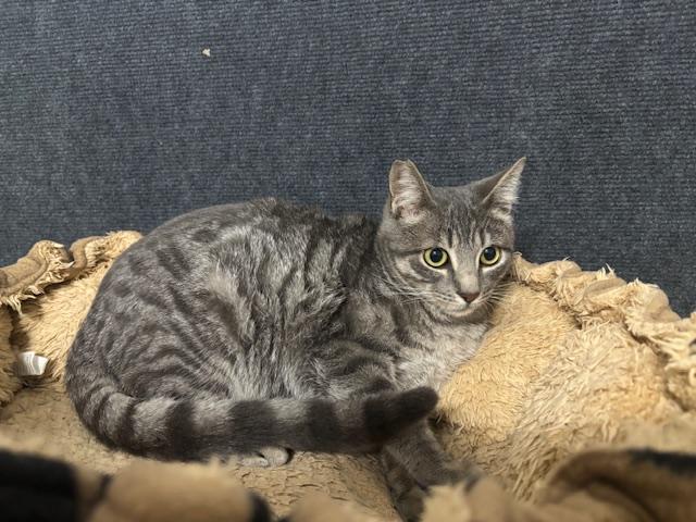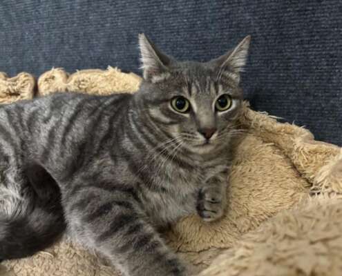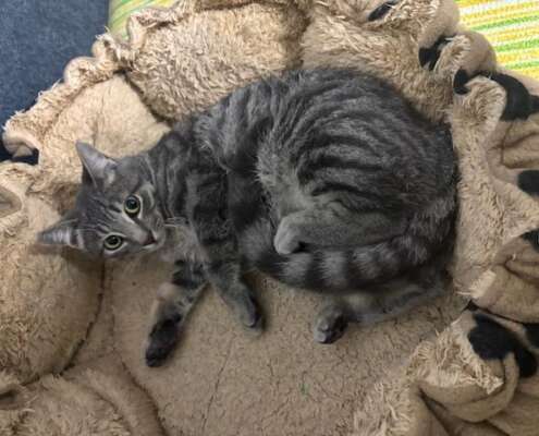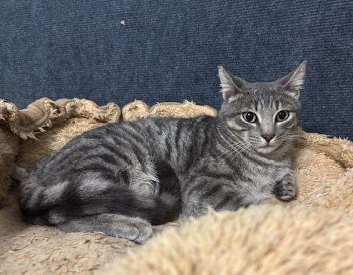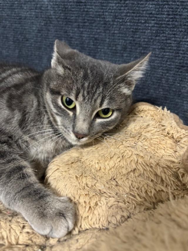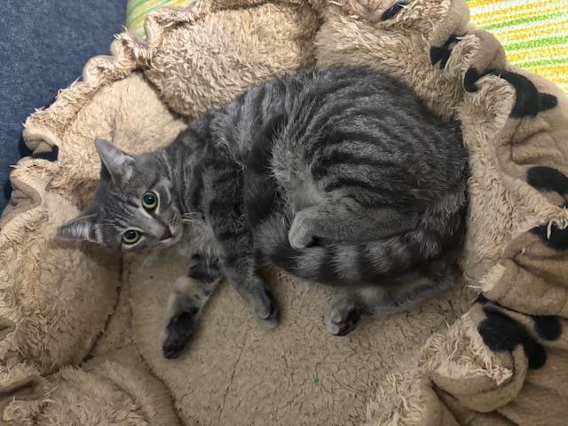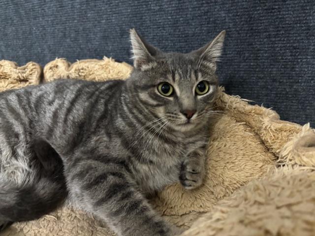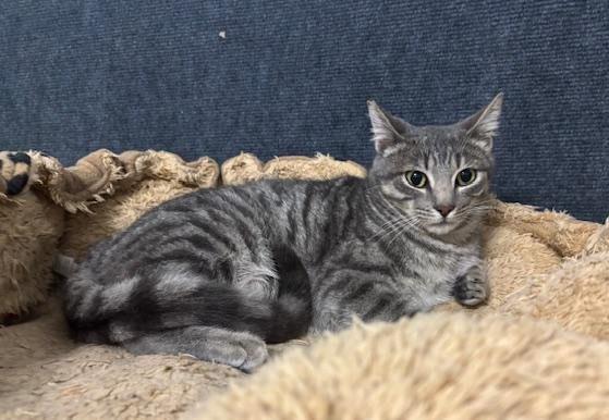 Carl es un gatito gris guapísimo, juguetón, comilón, le encanta el contacto con otros gatos y con las personas es un poco más tímido de primera pero se deja coger en brazo sin problemas y entra en el transportin perfectamente.