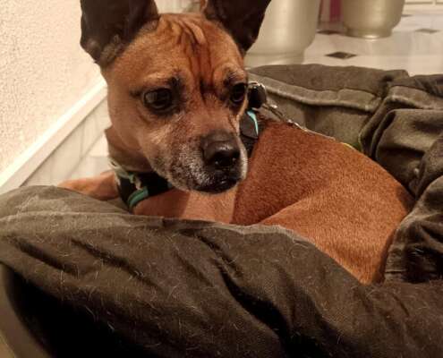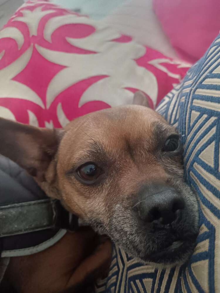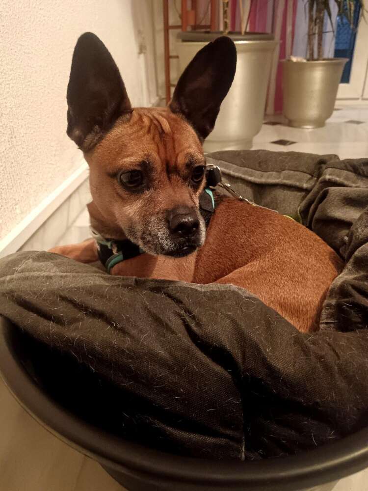 A Chispa se la encontró una voluntaria en la calle, sin chip. Se la llevó a su casa donde no pudo tenerla mucho tiempo porque su perro no la aceptaba.