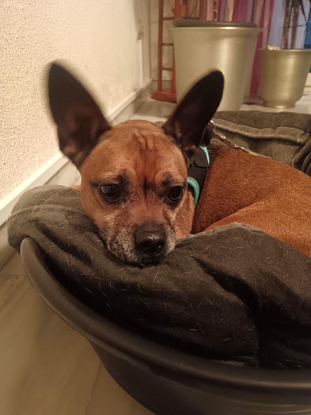 Fue adoptada y devuelta, sin explicaciones, porque en todos los videos demostraba ser una perra 10 y nunca se quejaron de ella. Pasea atada, se sabe comportar en casa, es muy cariñosa, obediente y lista, muy lista.