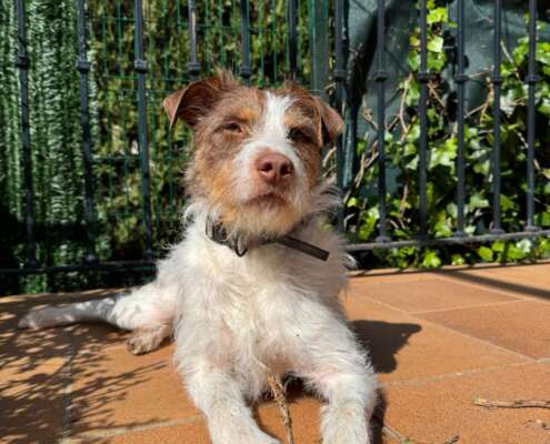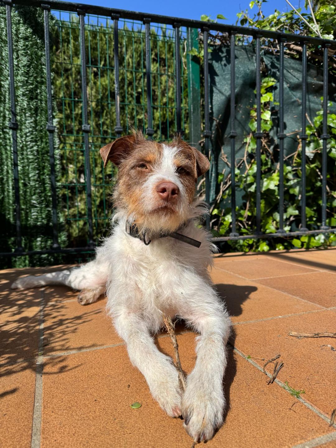 Vive en una casa de acogida donde hablan maravilla de él, ambiente relajado, aptitud y actitud con él, es un perro equilibrado que, como cachorro que es, de vez en cuando quiere diversión.