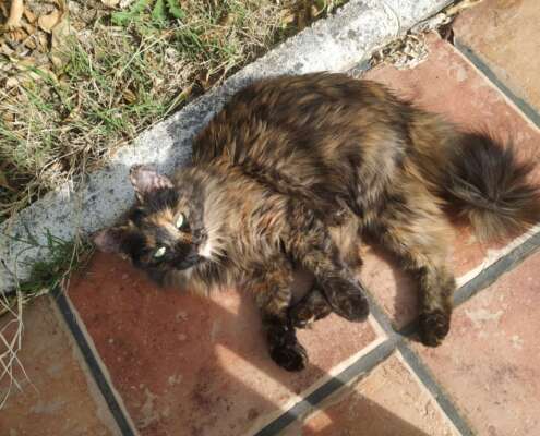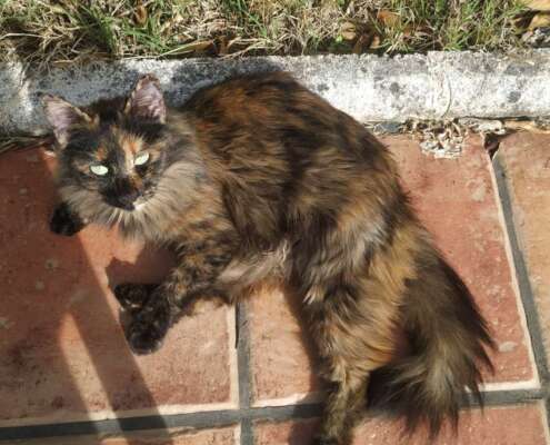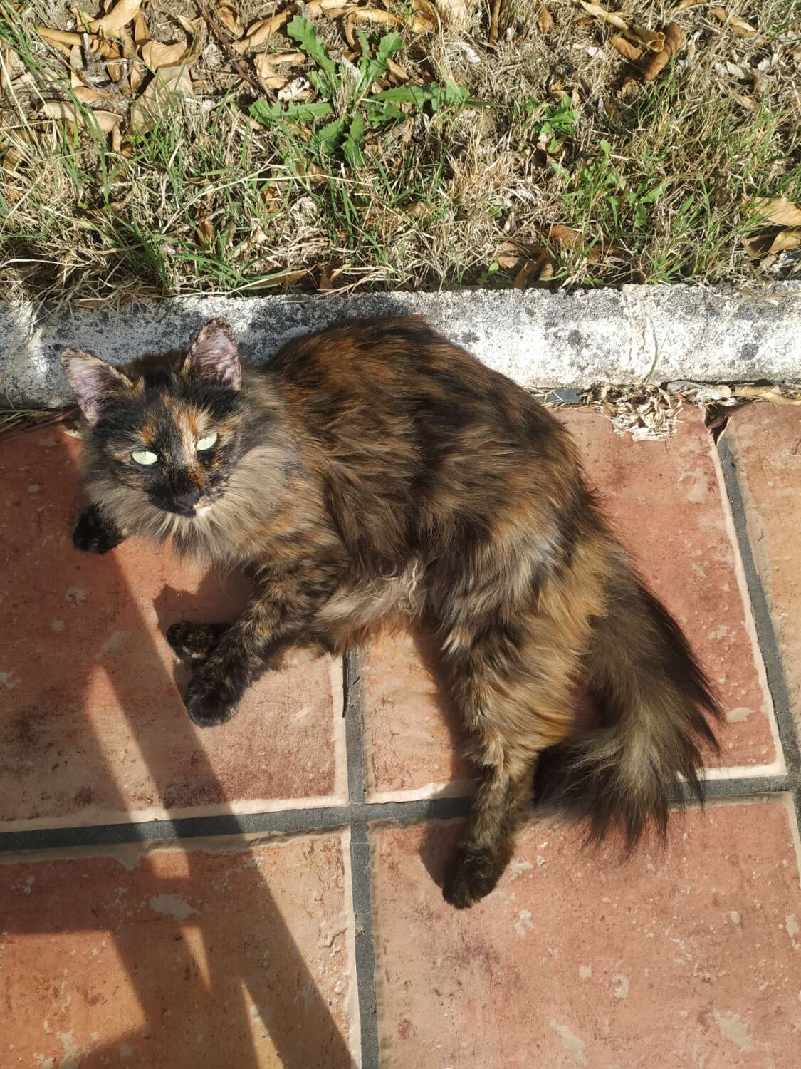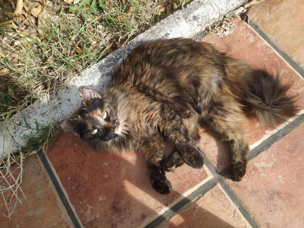 Está desparasitada, pero aún no se ha logrado cogerla para poder llevársela al veterinario y ver su estado general. Se cree que no esta castrada y seguramente no tenga las vacunas puestas.