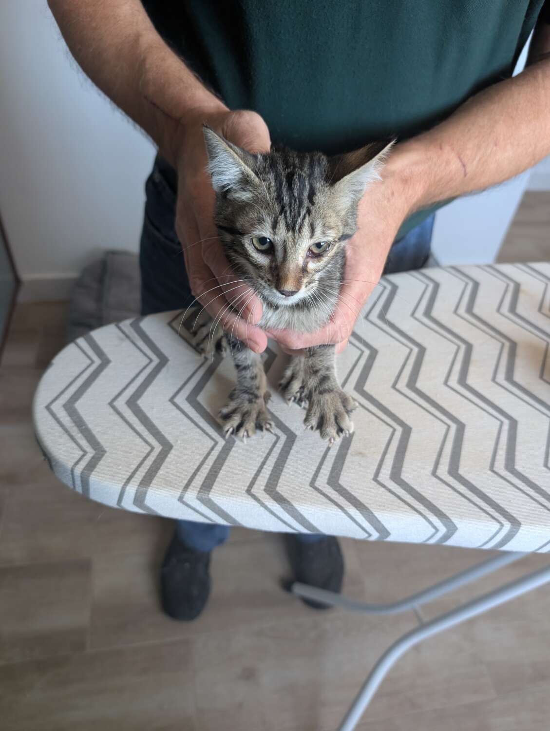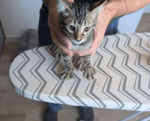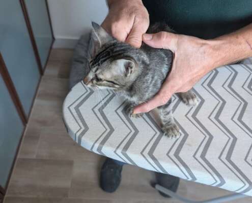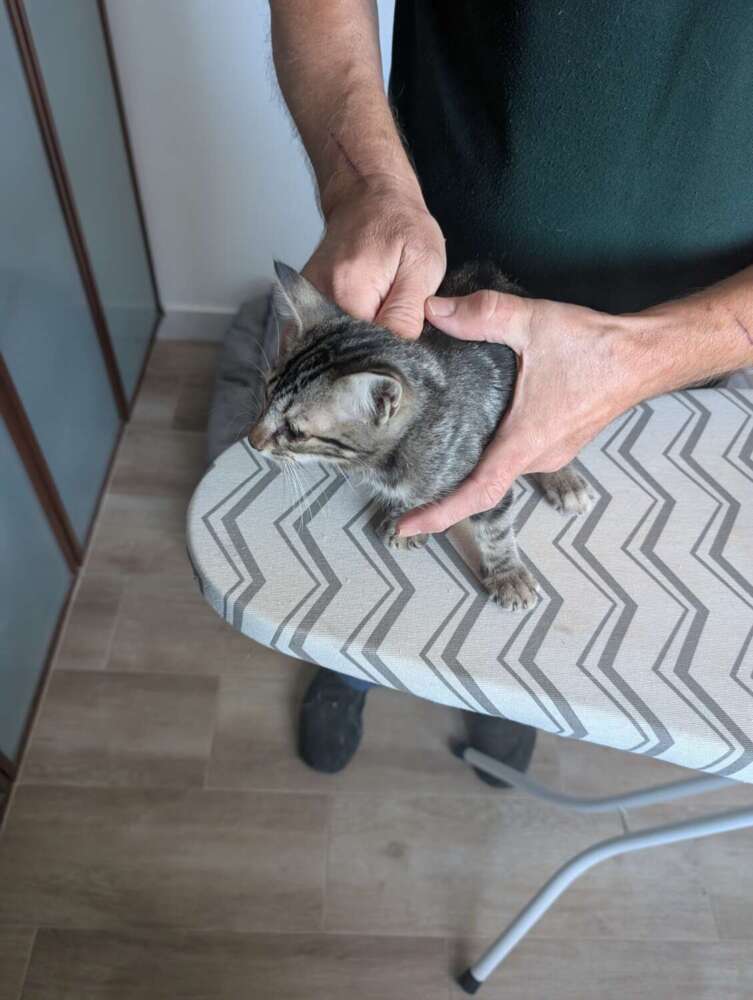 Gatito de aproximadamente 1,5–2 meses. Bastante bonito, pelaje medio largo, cola negra, restos atigrado. Buen carácter: asustado pero tranquilo. Tiene tratamiento oftálmico por infección ocular (en curso) y ha sido revisado por veterinario — puedo enviar informe/recetas.