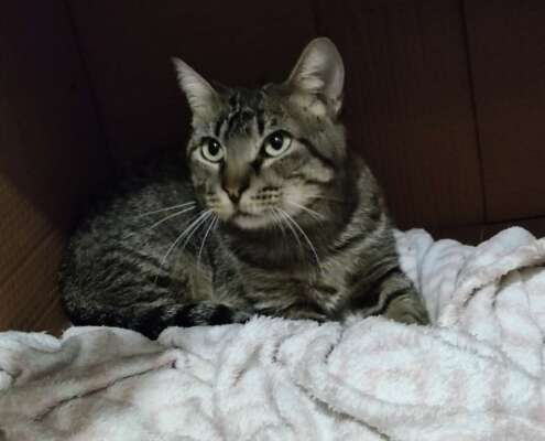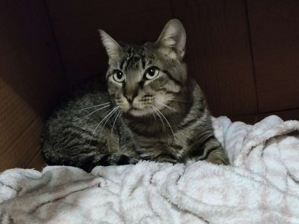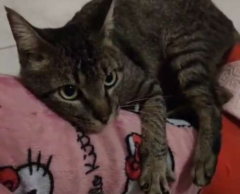 Es un gato muy cariñoso, no da ruido y es una bola de ronroneos, le haces dos tonterías y ya lo tienes vibrando como un motor y buscándote la mano para que le sigas acariciando, es un gato extremadamente cariñoso aunque un poco asustadizo ya que lo ha tenido que pasar mal…. Se merece una casa en la que le quieran y le den todos los mimitos que merece
