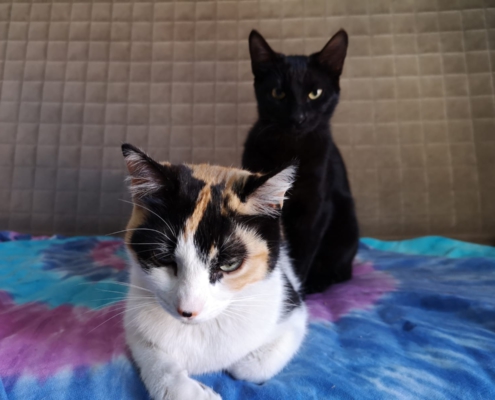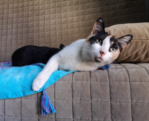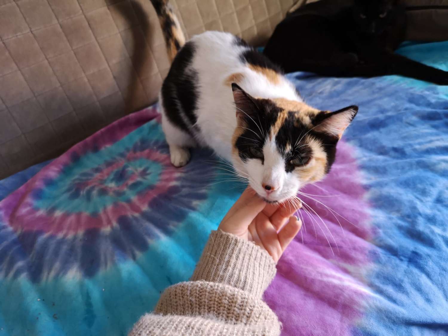 Isis es una gata tranquila que pide constantemente caricias poniendose panza arriba.