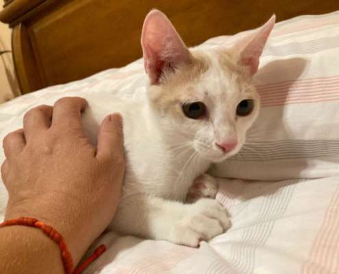 Su mamá era una gata callejera, una mañana un coche se cruzó en su camino y, ya sabéis el final… La mujer que la alimentaba la recogió y le dio una despedida digna. Al escuchar a los peques llorar, no pudo evitar cogerlos e intentar que al menos ellos tuvieran una vida digna y sin peligros.