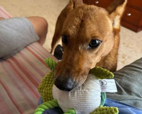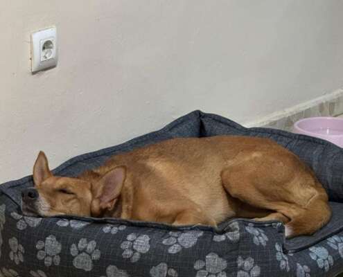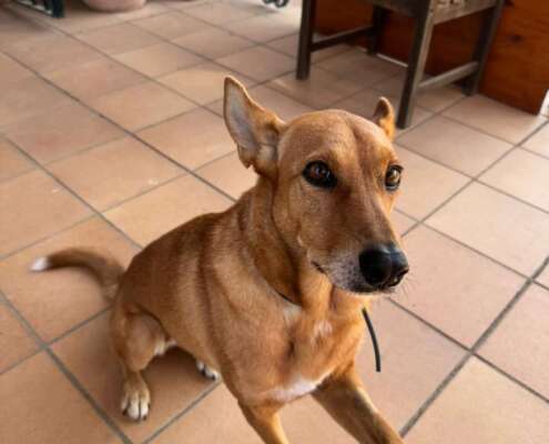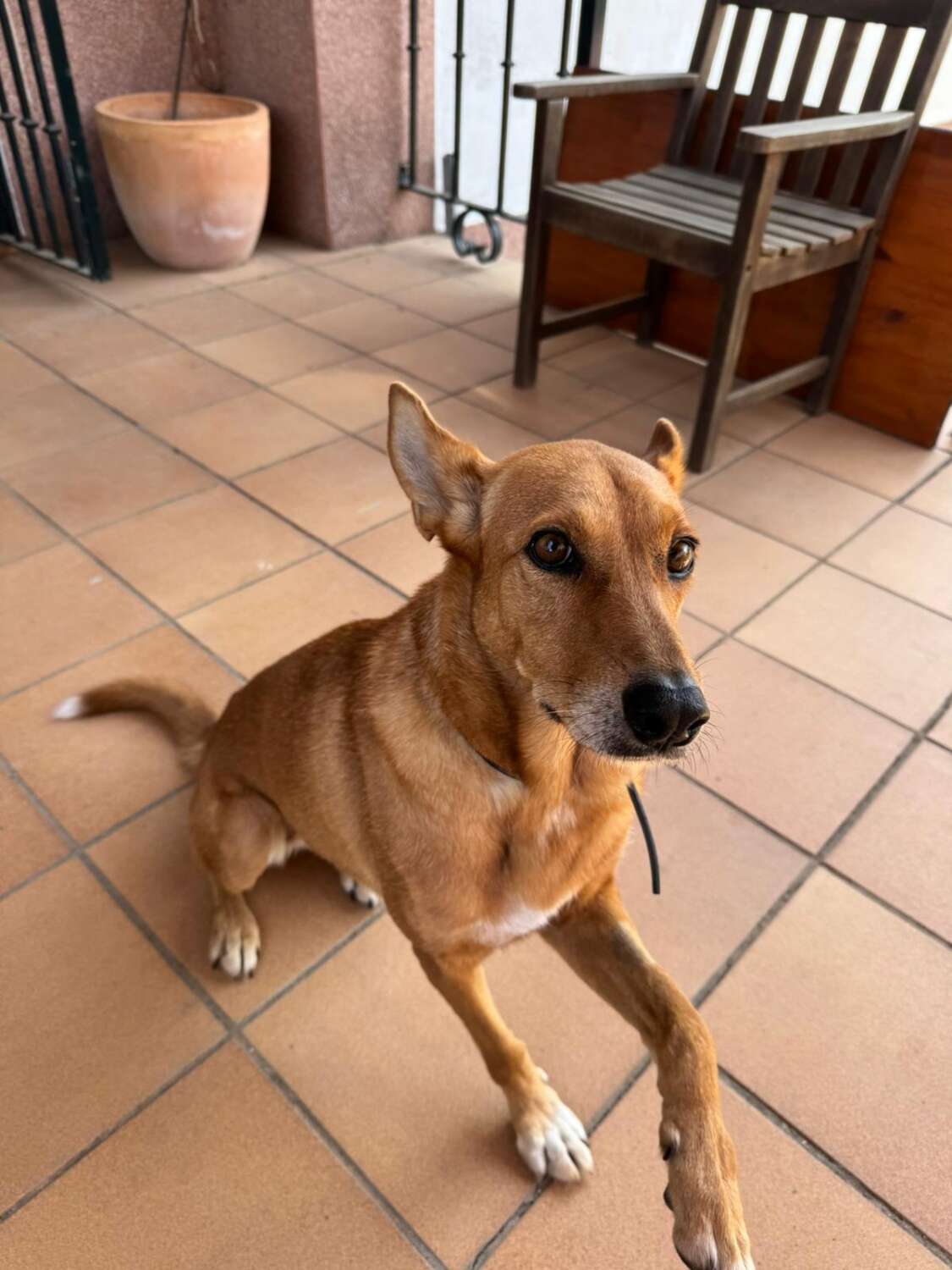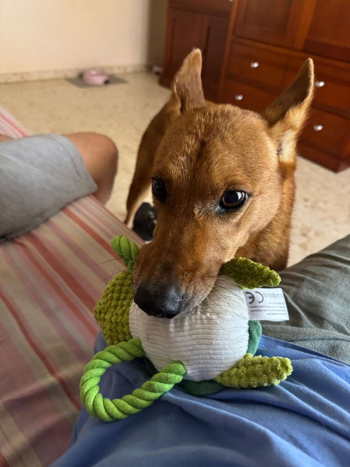 Es una perra supersimpática, juguetona y sociable, que disfruta saliendo al campo y compartiendo juegos con sus compañeros Papuchi y Uber, con quienes compartía jaula, y con muchos otros perros a través de la valla. Adora a los voluntarios, las chucherías y la sensación de libertad.