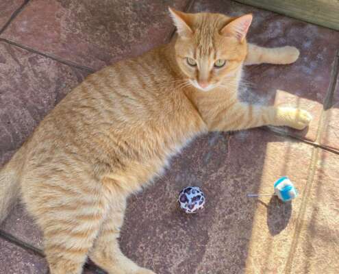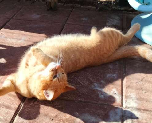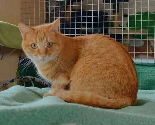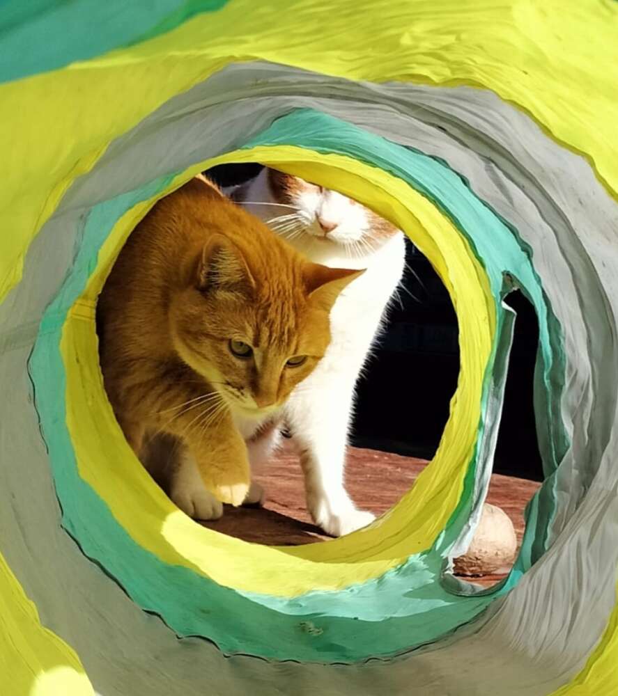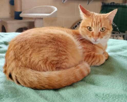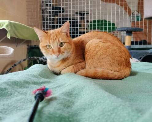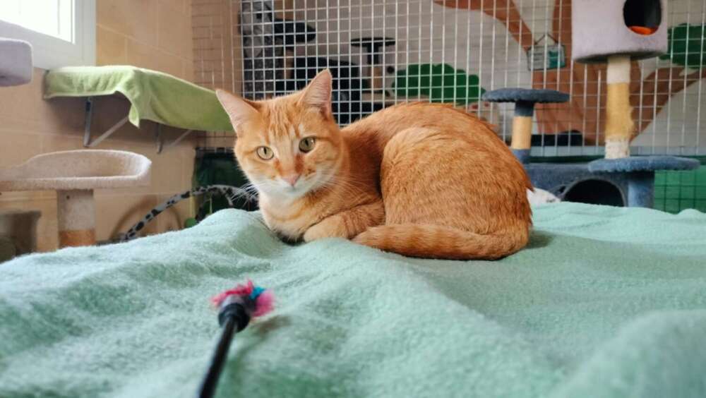 Nora es una gatita atigrada naranja, juguetona con todo tipo de juguetes, le encanta apoyar su cabeza en la tuya, subirse por tu cuerpo trepando, darte con su manita para que le dediques tiempo y muy charlatana, ronronea a no poder más, pero necesita unos días para confiar y demostrarte todo el amor que tiene para dar.