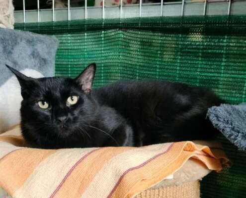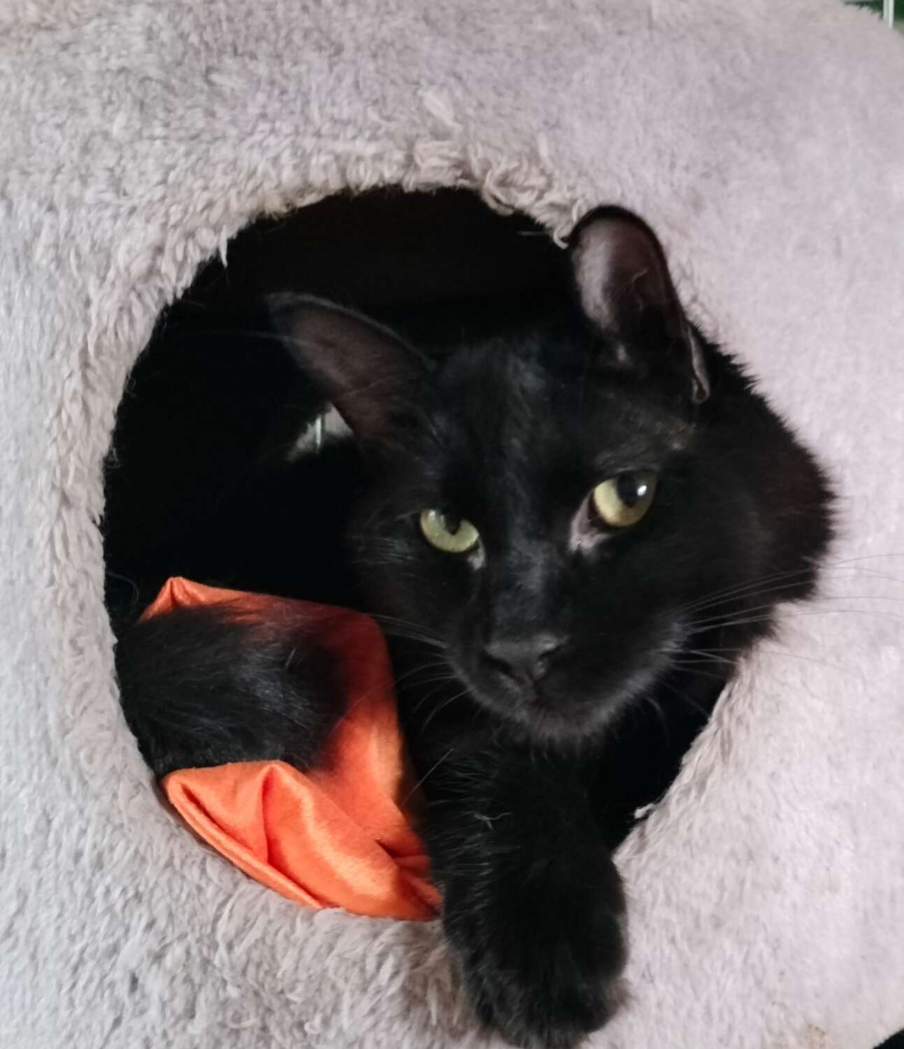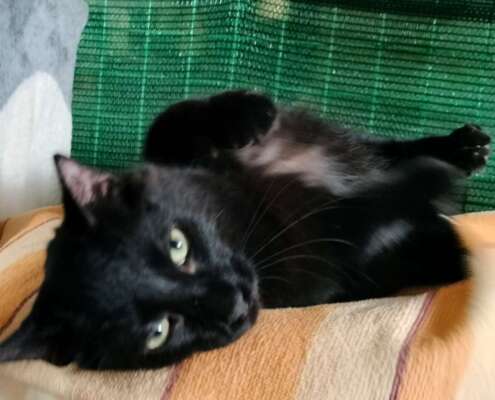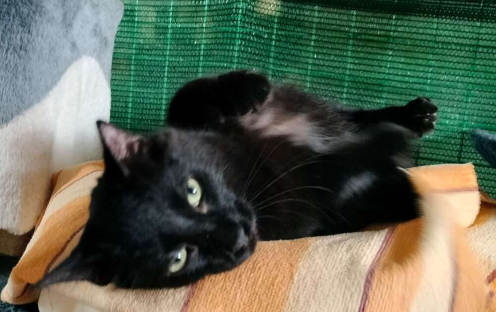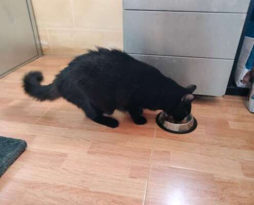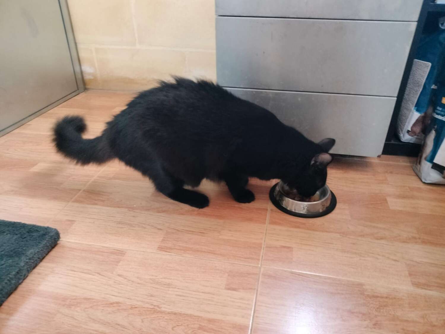 Pelocho es un negrito de pelo largo suave, con unas zonas de su cuerpo con pelo blanco, como con canas, es una máquina de ronroneo, hasta comiendo no para, es sociable con gatos, perros, le encanta mirarte y maullar para llamar tu atención, juguetón, cariñoso, un gato perfecto para formar parte de una familia.