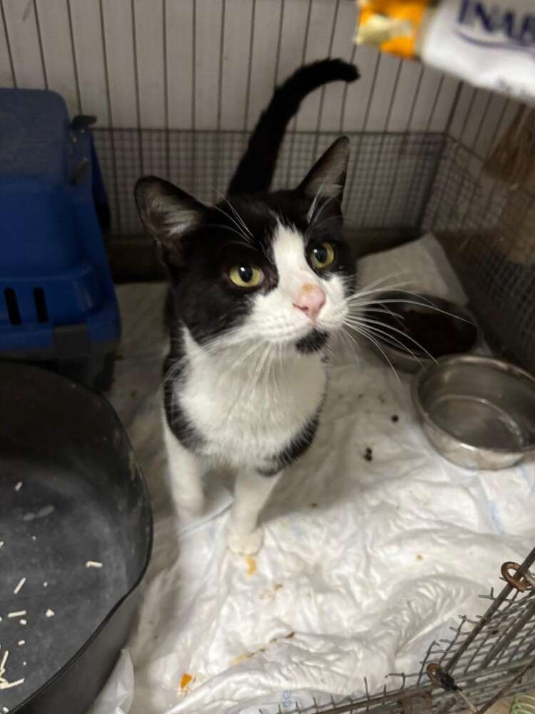 Pepo apareció por una barriada de un pueblo de Sevilla en unos contenedores los días que más llovía, había muchas personas que le daban de comer, pero ninguna lo cogía, hasta que llegó su ángel guardián, contra viento y marea, (nunca mejor dicho ) aguantó allí horas y horas hasta que entró en la jaula.
