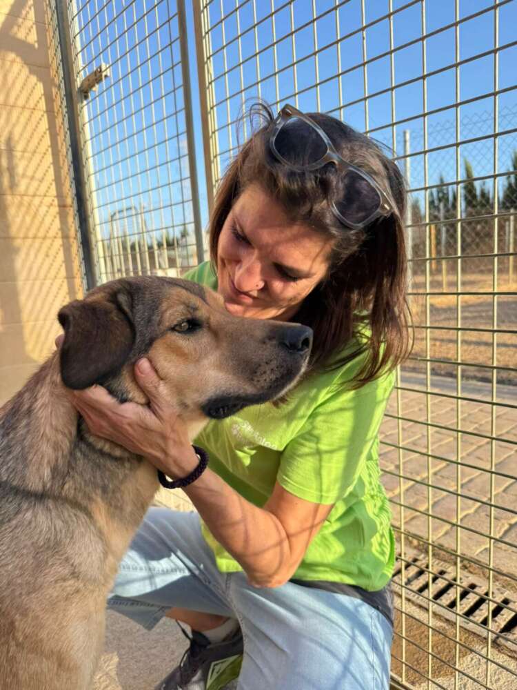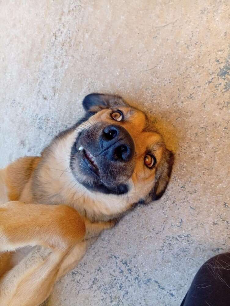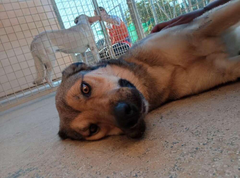 Es un perro activo, comparte juegos con Abby, con la que disfruta en el campo, pero le encanta estar con los voluntarios, tumbarse en el suelo y mostrar su barriga