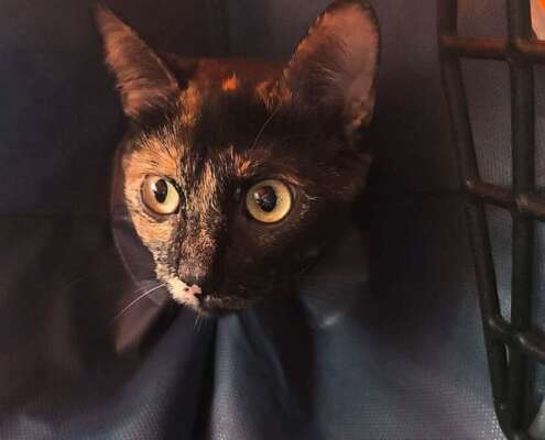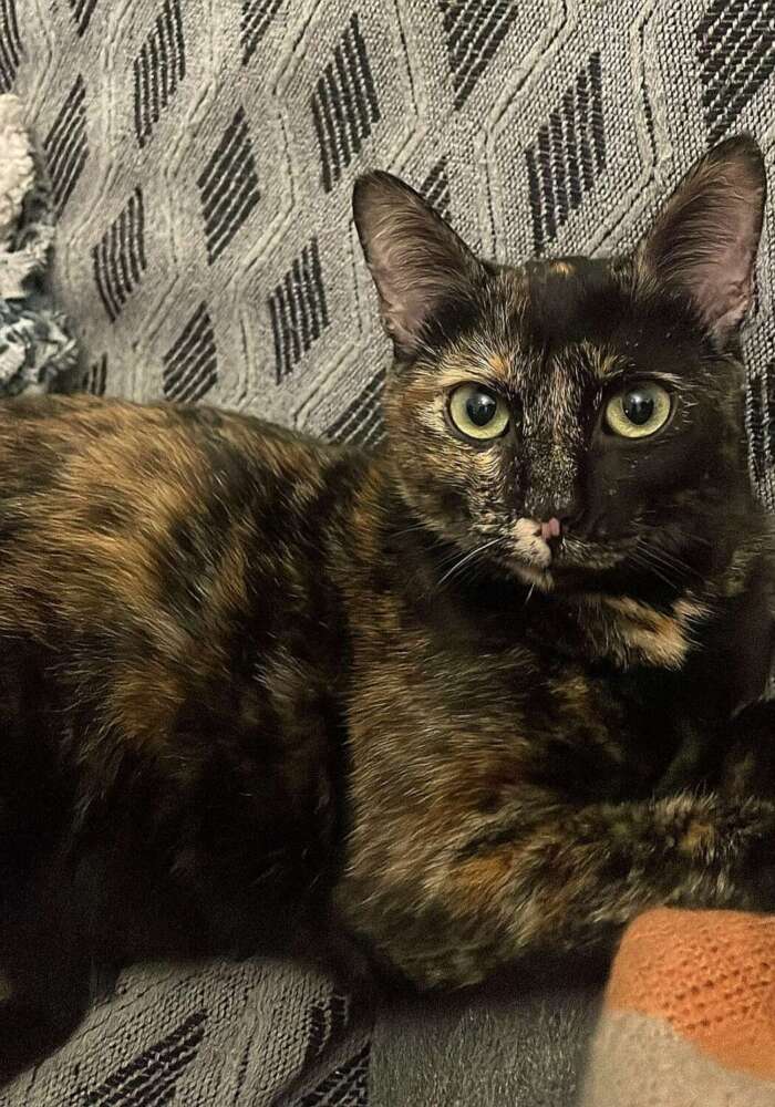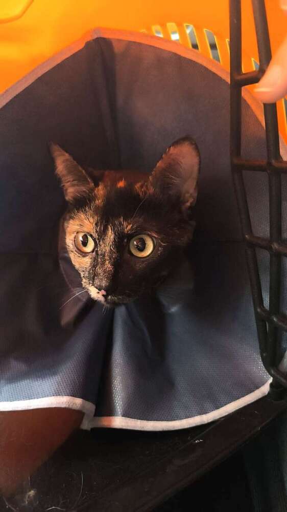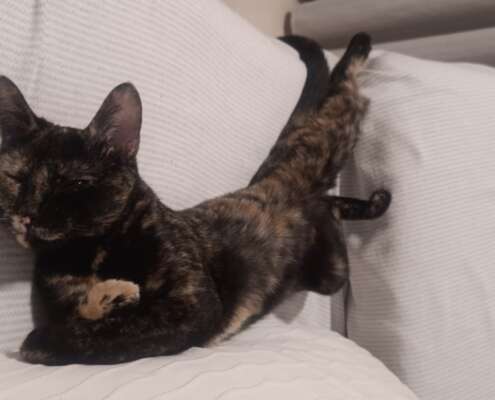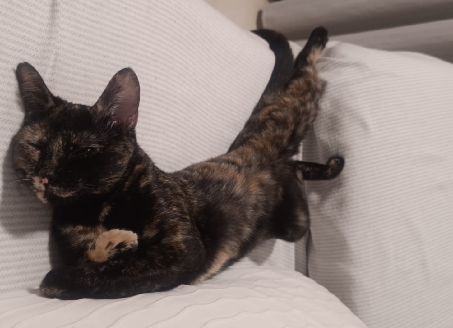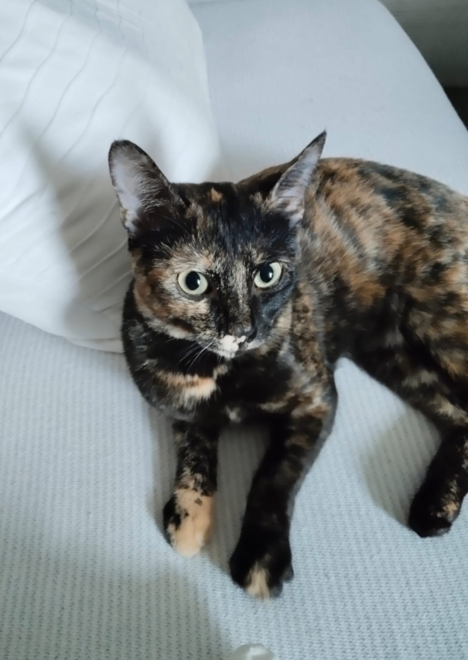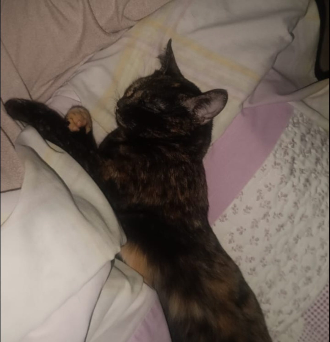 Apareció en una zona muy transitada por coches y donde no hay otros gatos (seguramente la abandonasen allí). Estuvieron creándole un horario para poder cogerla, pero tenía mucho miedo. Mientras se ganaban su confianza, un gato adulto empezó a venir a buscarla por las noches para pegarle. Conseguimos cogerla y, tras un tiempo trabajando con ella, confía en los humanos. Convive con otros gatos con facilidad, es muy buena y juguetona. Le encanta dormir acurrucada con los humanos y los otros compañeros gatunos.