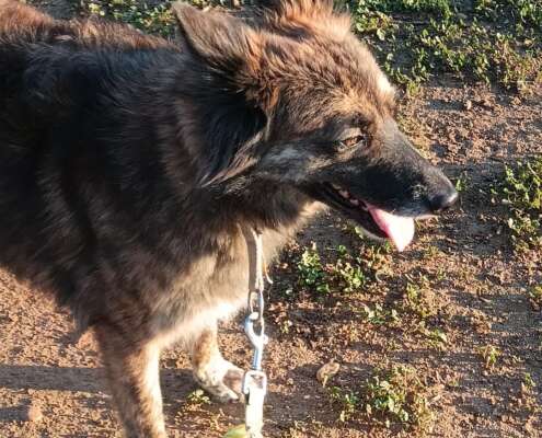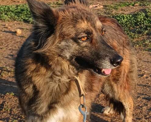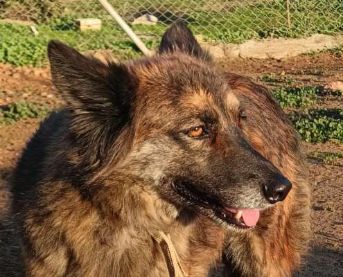 Thelma y su hermana Louise estaban en otra protectora donde, por falta de voluntarios, no podían atender sus miedos, por eso llegaron a Arca. Han pasado en varios meses de no mirarnos a la cara a querer salir a los campos en cuanto que nos ven llegar. Aún desconfían, pero los avances han sido extraordinarios.