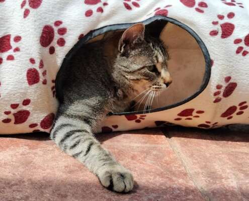 A Tigre lo recogió de cachorrito un matrimonio mayor, tenía mal aspecto y muy delgado, los síntomas de cualquier cachorro sin alimentación en la calle. Lo llevaron al veterinario, lo cuidaron y, gracias al amor de esta familia, salió adelante. Pero los 3 gatos del matrimonio son muy mayores y no aguantan la energía de Tigre. Su familia quiere el mejor futuro y hogar para Tigre, por este motivo llegó a nosotros.