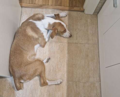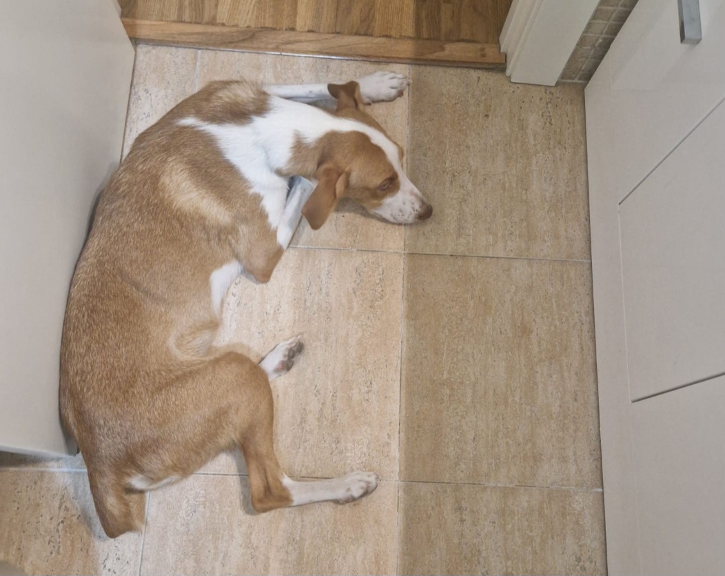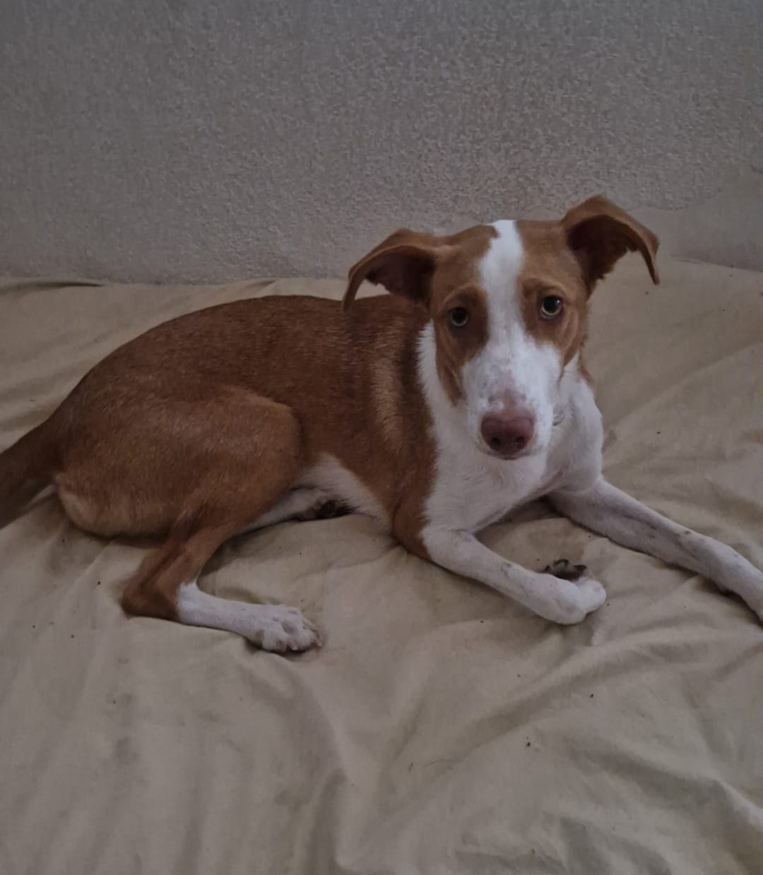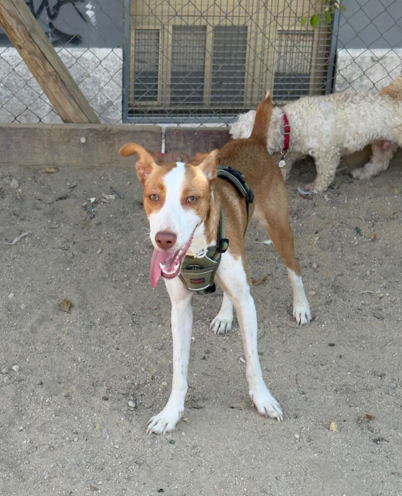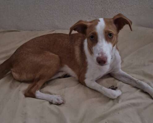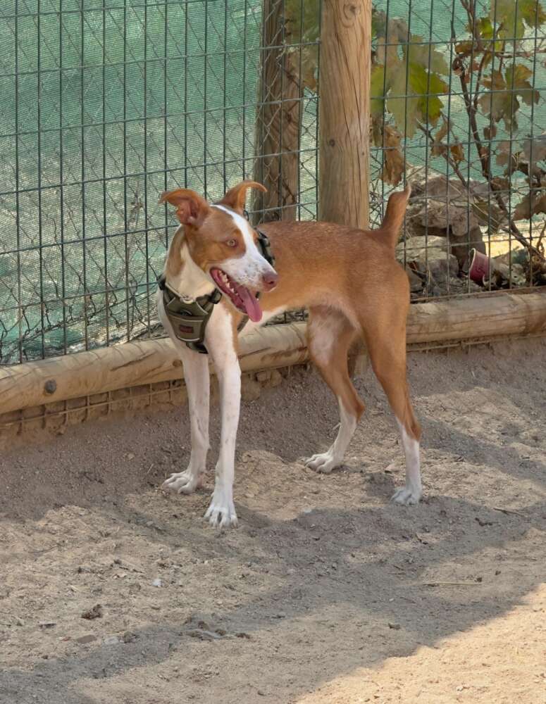 Se llama Yara, tiene un año y es mezcla de podenco con bretón, pesa 12 kg, tiene el chip, las vacunas al día, desparasitada y está castrada.